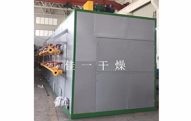 物料由加料器均勻地鋪在網(wǎng)帶上,網(wǎng)帶一般采用12-60目不銹鋼絲網(wǎng),由傳動(dòng)裝置拖動(dòng)在干燥機(jī)內(nèi)移動(dòng)。干燥機(jī)由若干單元組成,每一單元熱風(fēng)獨(dú)立循環(huán),部分尾氣由專門排濕風(fēng)機(jī)排出,廢氣由調(diào)節(jié)閥控制,熱氣由下往上或由上往下穿過(guò)鋪滿物料的多層網(wǎng)帶完成熱量與質(zhì)量傳遞的進(jìn)程,帶走物料水份。網(wǎng)帶緩慢移動(dòng),運(yùn)行速度可根據(jù)物料溫度自由調(diào)節(jié),干燥后的成品連續(xù)落入收料器中。上下循環(huán)單元根據(jù)用戶需要可靈活配備,單元數(shù)量亦可根據(jù)需要選取。