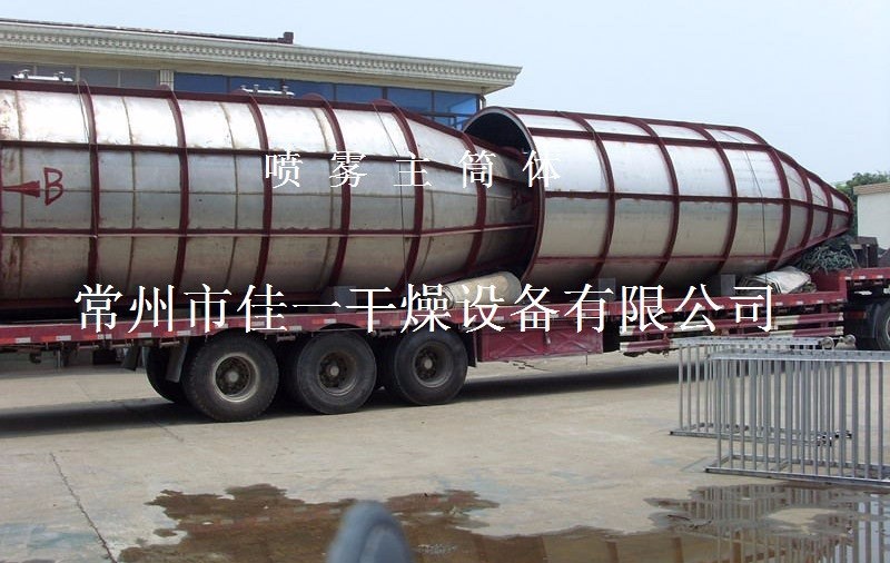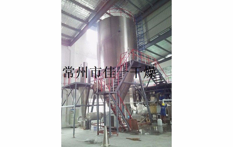 空氣經(jīng)過(guò)濾和加熱,進(jìn)入干燥器頂部空氣分配器,熱空氣呈螺旋狀均勻地進(jìn)入干燥室。料液經(jīng)塔體頂部的高速離心霧化器,(旋轉(zhuǎn))噴霧成極細(xì)微的霧狀液珠,與熱空氣并流接觸在極短的時(shí)間內(nèi)可干燥為成品。成品連續(xù)地由干燥塔底部和旋風(fēng)分離器中輸出,廢氣由風(fēng)機(jī)排空。